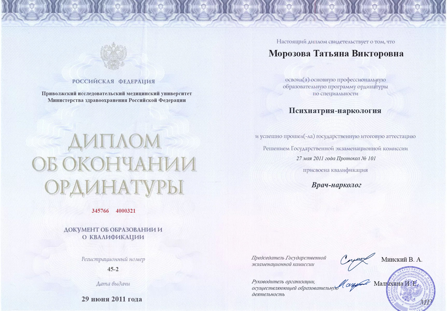 Диплом об окончании ординатуры Морозовой Татьяны Викторовны