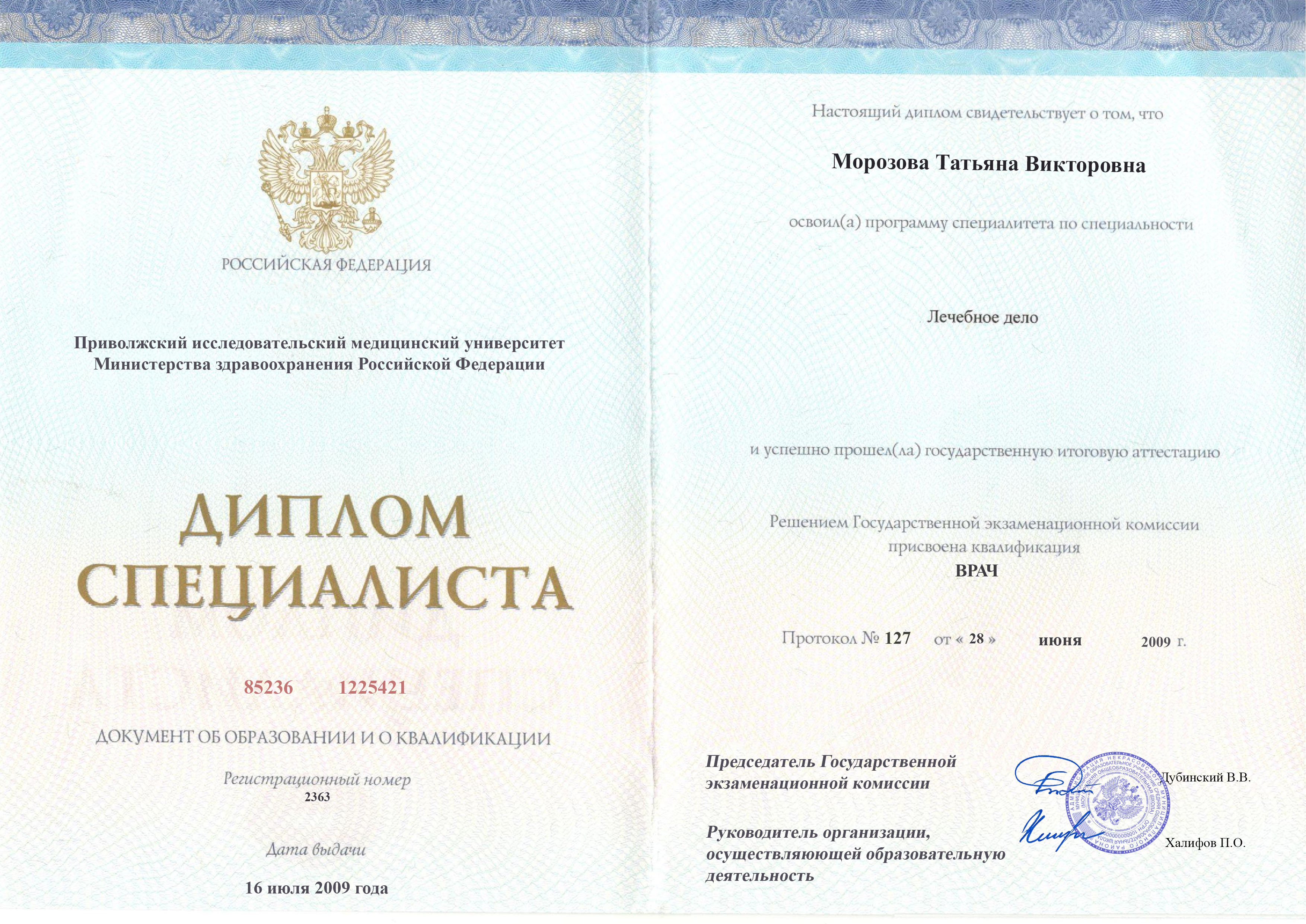 Диплом специалиста Морозовой Татьяны Викторовны